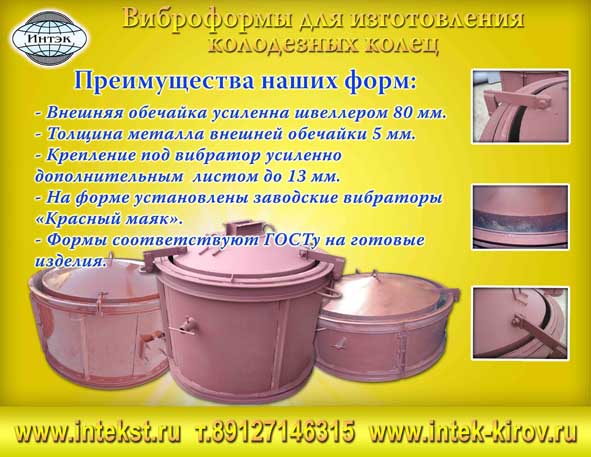 Группа предприятий ООО «Интэк» производит и реализует металлические формы для производства колодезных колец КС-7.9; КС-10.9; КС-15.9; КС-20.9, а так же формы для крышек и днищ колодцев (ПП-10; 1ПП-15; 1ПП-20). По желанию заказчика наш завод может изготовить формы под любой другой размер. При покупке металлической формы, технология производства колодезных колец предоставляется бесплатно.Качество, гарантия, низкие цены, сервис-все это сочетается в одном слове-«Интэк» У наших сотрудников вы можете получить исчерпывающие ответы на все ваши вопросы.
